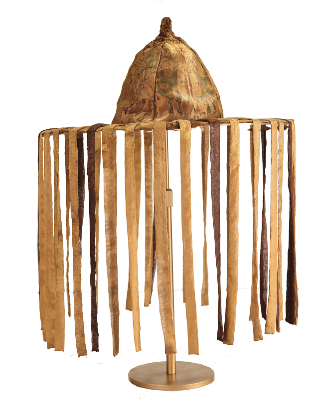 整顶帽子的款式与笠帽较为相似,其中帽冠部分由六片圆三角形织物拼缝而成,帽檐采用中亚风格的斜纹纬锦作面料,主题图案为联珠窠内的花树对鹿。在帽檐和帽冠相交处还缝有35根垂带,以4根浅米色菱格纹暗花罗和1根深褐色菱格纹暗花罗垂带间隔排列。