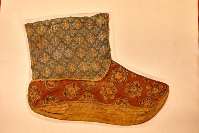 红地宝花刺绣靴袜,锦袜分袜筒、袜背和袜底三个部分。袜筒蓝地黄花,花纹是当时十分流行的小型宝花和十样花纹,交错排列。袜背红地,上用黄、蓝等色以锁绣针法绣出小型宝花纹样。宝花六瓣,花蕾外有六片叶穿插。袜底以几何纹绫为底,以跑针绣出矩形格子纹。