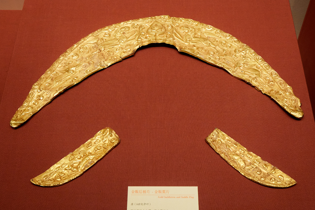 这组马鞍饰片由后桥片和两侧侧护翼片组成,边缘有钉孔孔眼。采用捶揲法制成。后桥主题纹样以中心花两侧对称展开双狮和双马,边缘饰以卷草和云纹。双狮奔跑,张嘴吐舌,腋下卷草伸出。双马蹄足飞扬,头部羚羊弯角上饰月形冠顶,鬃毛飘动,翼翅花草上展出三根长羽,后退腋下生出卷草,狮尾。翼片上主体纹样为奔跑的长角山羊。马鞍饰片整体风格动感十足,展示了高原草原游牧文化高超的制作工艺和活泼的审美意趣。