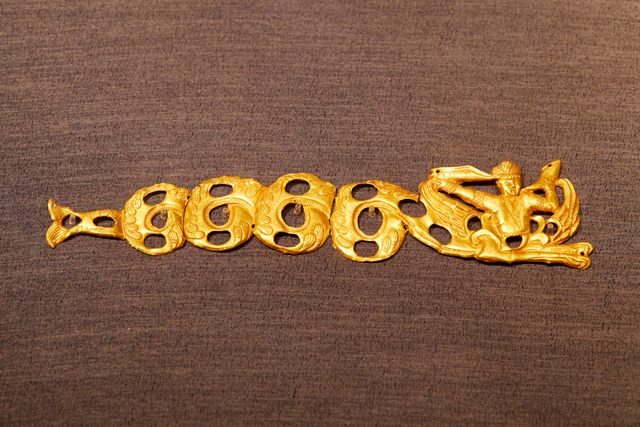 饰片轻薄,花纹錾刻而成。整体呈长条形,前宽后窄,周缘有钉孔。前端为人物形象,束发额带,后飘绶带,翻领袍服,右持来通,左抓羽尾,身带双翼,下为鸟足,身后为回旋鱼身鱼尾,有鱼鳞纹饰,镂空处原镶嵌有宝石,已脱落。器物可能属于剑鞘的装饰。人身鱼尾形象罕见特殊,带有神话宗教内涵,具有特殊的研究价值。(都兰县博物馆)
