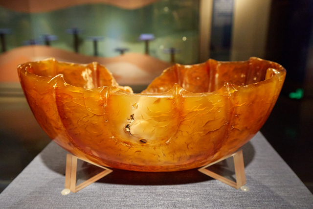 用整块酱黄色玛瑙制成,器壁厚重,透光性好,琢磨光滑,通体呈玻璃光泽,可见片状结晶和片裂开线。杯口呈椭圆形,中间内凹,两端翘起,寰底,有十二个横向的曲瓣,杯内两侧弧形突棱在腹壁。此件器物原料较大,色彩瑰丽,加工精美,是西方文化影响下的产物。(都兰县博物馆)