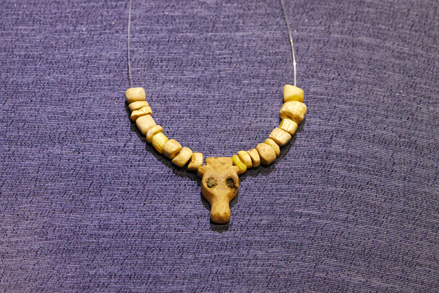 中间挂饰为方解石质,呈牛头状,双眼为铜渣镶嵌。其余小珠子为钠钙玻璃珠,组成一组串饰。