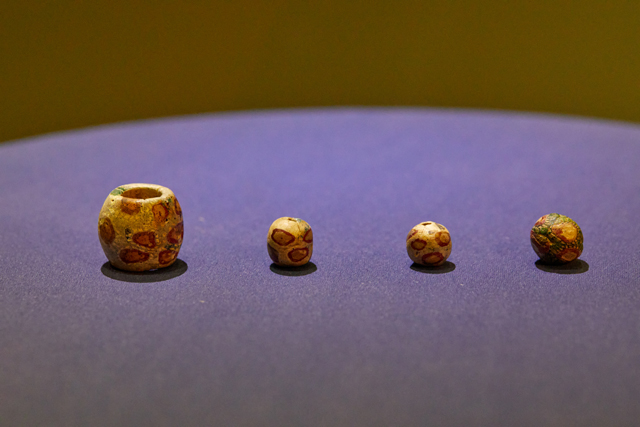 通体呈绿色或蓝绿色,表面呈浅黄色圆斑,均为同心圆纹,这些珠子均由四种不同的料组成,为搅胎琉璃,后进行钻孔及后期的加工修整。
